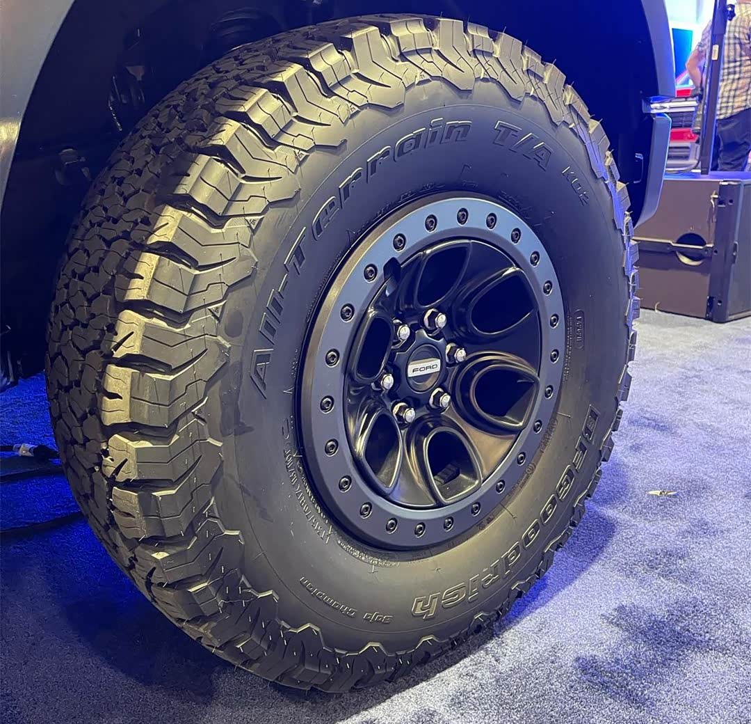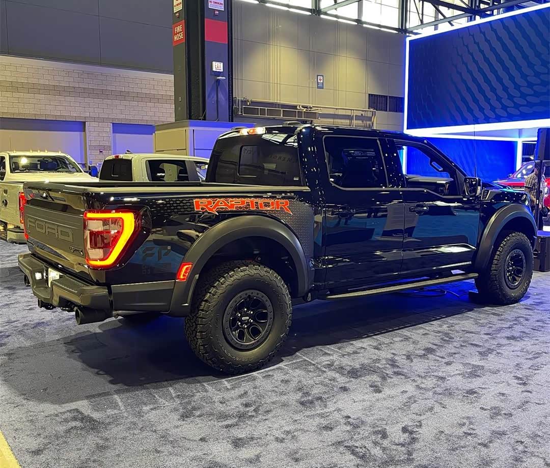 车身侧面与现款相比变化不大,依旧是标准的美系皮卡身材。同时新款F-150猛禽还提供了三种不同造型的轮圈,并配备百路驰KO2全地形轮胎。车尾造型同样威武有力,黑色的尾箱饰板和保险杠与车头进行了互动,造型设计有始有终。