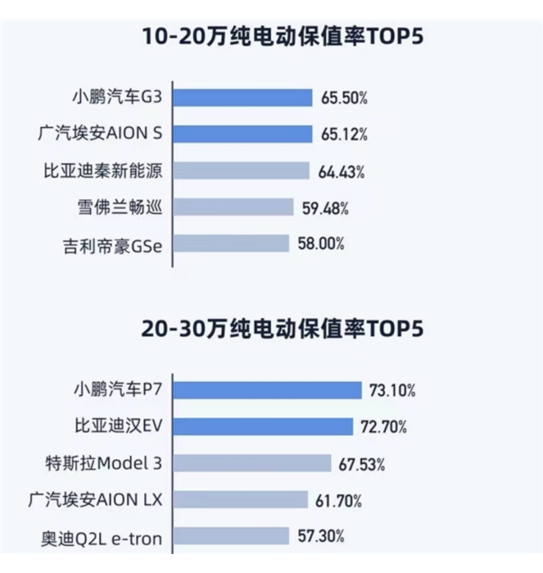 小鹏G3和小鹏P7,分别夺得10-20万、20-30万纯电动车的保值率TOP 1,第一,NO.1。而且这个细化榜单是计入了非中国品牌的车型的综合对比。