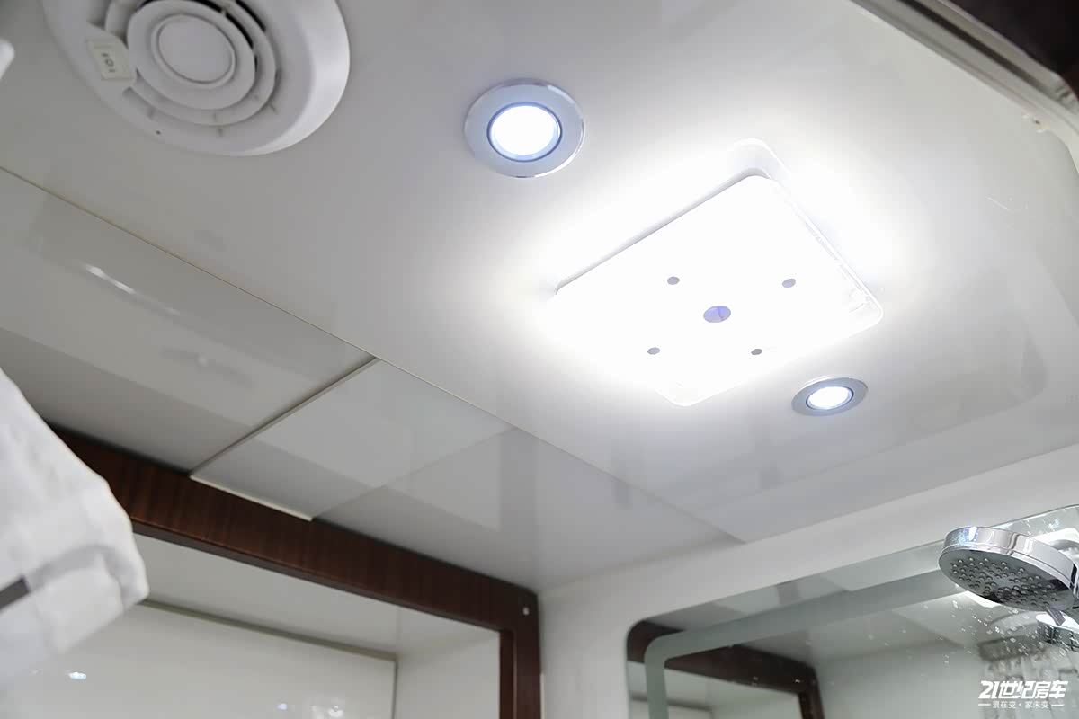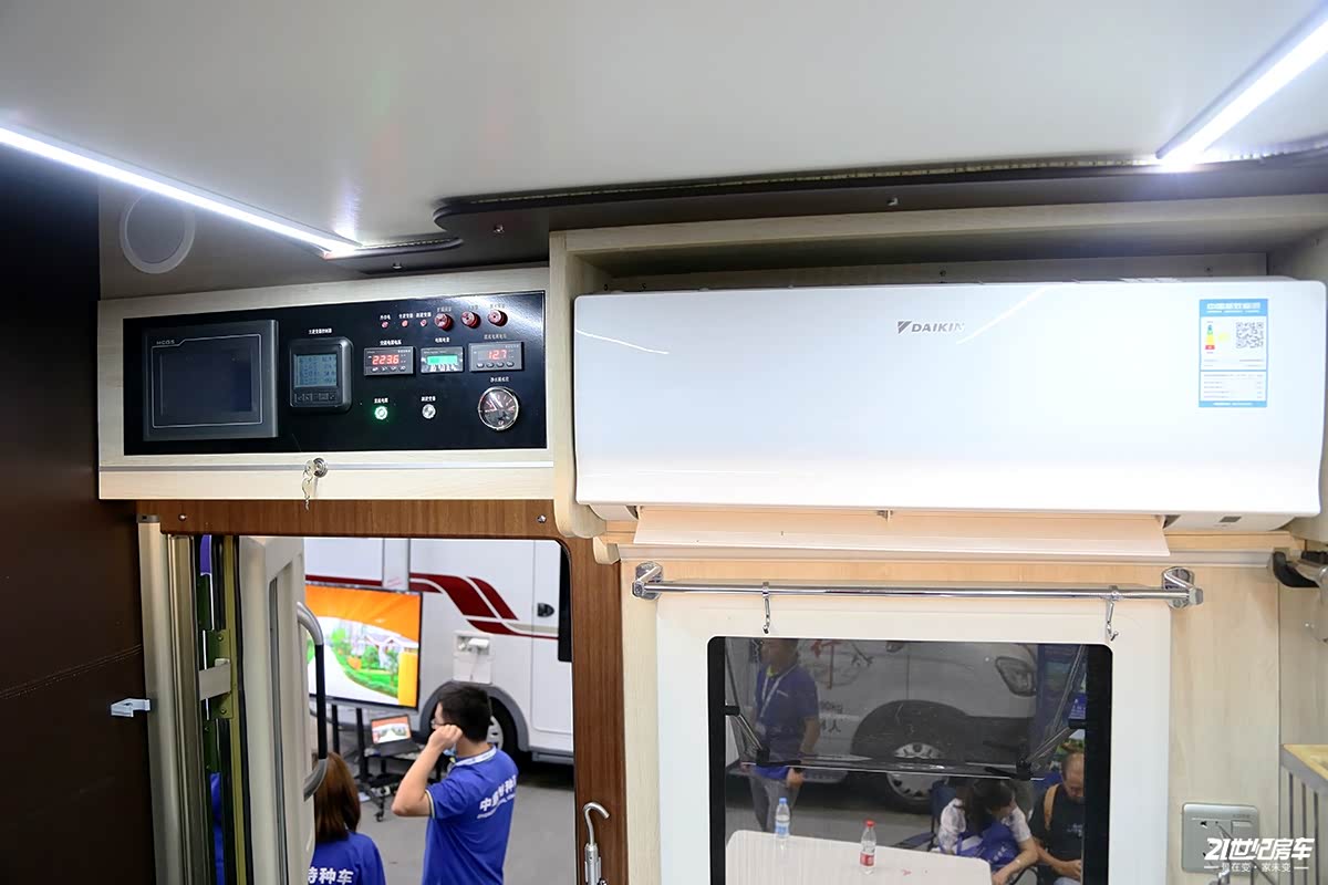 中部厨房区采用一体式橱柜设计,台面平整,包括带盖式不锈钢洗菜池;下方空间可存放日常碗具。其它方面配备电磁炉、微波炉、后行车暖风系统、燃油加热器、1.5P家用空调、烟雾报警器等;室内多个220V电源插座及USB充电接口可满足日常充电需求。位于乘客门上方的集成控制面板,屏幕显示车内设备读数时,周围按键也可控制车内照明灯及电器设备开关。