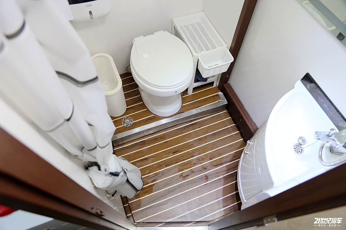卫生间采用干湿一体式设计,内部配备盒式马桶、洗手池、梳妆镜、毛巾架、一体式淋浴花洒等;水路方面,180升净水箱,60升灰水箱、40L黑水箱。伸缩式卫生间格局尤为新颖,该项技术已获国家实用新型专利认证,军工品质打造的卫生间拓展机构,严格意义上来讲,属于车体的外延机构,并非定义为拓展舱,设计师当初考虑到空间不足的痛点,将其进行了外部延伸,形成了一个外延机构,即使内部坐人也不会变形,不易发生侧倾等现象,因为拓展舱底部采用槽钢作为支撑,坚固耐用。
