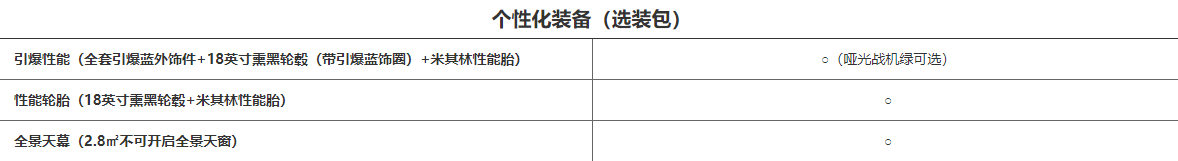 还有一点就是,目前影豹拥有三个选装包供消费者进行个性化调整,分别为3000元的引爆性能(全套引爆蓝外饰件+18英寸熏黑轮毂(带引爆蓝饰圈)+米其林性能胎)、3000元的性能轮胎(18英寸熏黑轮毂+米其林性能胎)以及3000元的全景天幕(2.8m²不可开启全景天窗)。需要注意的是“引爆性能”选装包只有在选装哑光战机绿这个车色时才能够选装,同时J15、J16版可以在上述三种选装包中进行选择;J11版只可以选装“全景天幕”;J10飞人版则无法进行选装配置。