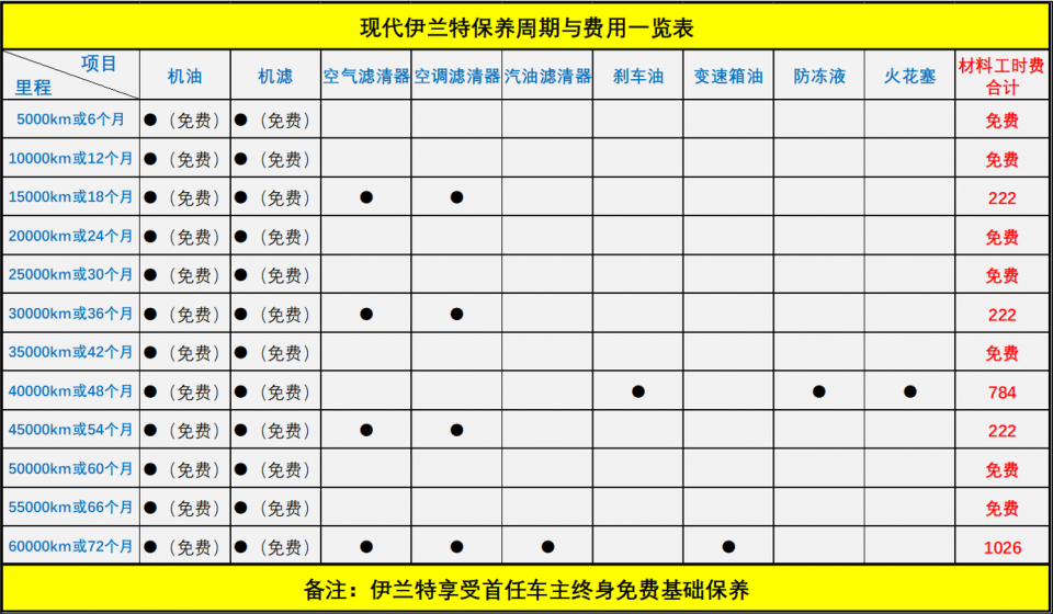 在保养上,伊兰特整体确实足够的便宜,这确实要归功于他的“首任车主终身免费基础保养”政策。