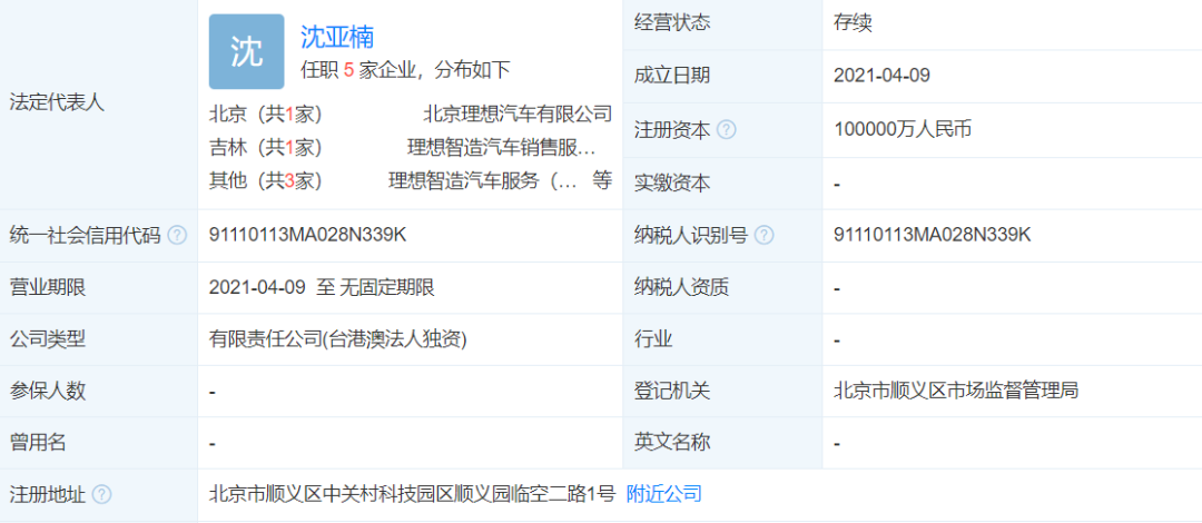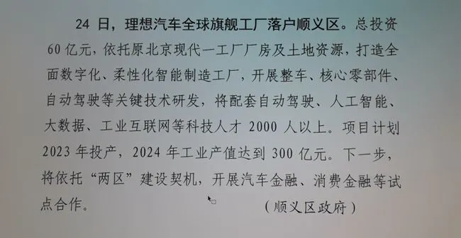 据5月14日北京市顺义区人民政府官网发布的《顺义区国民经济和社会发展第十四个五年规划和二〇三五年远景目标纲要》中附件显示,在顺义区“十四五”期间拟实施重大工程项目中,“理想汽车第二生产基地 年产能 25 万辆,增程式纯电动 SUV 生产基地”被列入“高精尖产业”中,建设内容为“年产能25万辆,增程式纯电动SUV生产基地”。此外,北京理想汽车有限公司于今年4月9日成立,法定代表人为理想汽车联合创始人沈亚楠。