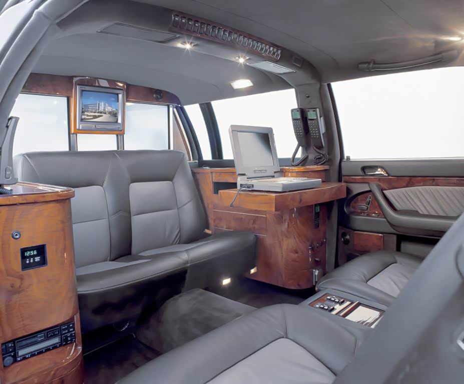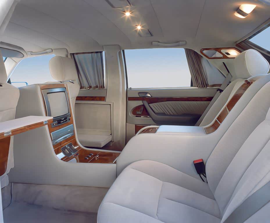 普尔曼版本的防弹车,内饰更加奢华,甚至还配备了折叠办公桌、后排专用影音娱乐系统、前后排通话装置。更关键的是,普尔曼版本采用了6座布局,后方可以形成一个小型商务洽谈区。
