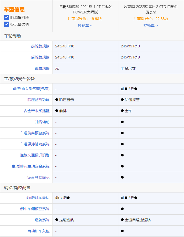 此次对比车型为MG6 2021款1.5T混动X POWER大师版(车身价19.98万元,下称MG6 X POWER),领克03 2022款03+ 2.0TD自动性能套装(车身价22.88万元,下称领克03+)。