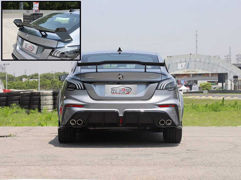 MG6 XPOWER的车身宽度要大于领克03+,但后者通过丰富的平直线条来拉升尾部视觉宽度,看上去也比较低。两款车都配备原厂大尺寸尾翼,MG6 XPOWER采用赛车风格的高位尾翼,由热压罐干碳工艺打造的全碳纤维材质,轻量化出色,整车空气套件极速可提供84kg的下压力,底部有大尺寸扩散造型,可以让车底空气流速提升7%。熏黑的尾灯,双边四出的排气自然也不会落下。领克03+的尾翼紧贴车身,看起来没有那么高调,空气套件也能提供40kg的最大下压力。同样有双边共四出的排气管和扩散器造型底护板,不过看起来要复杂很多。