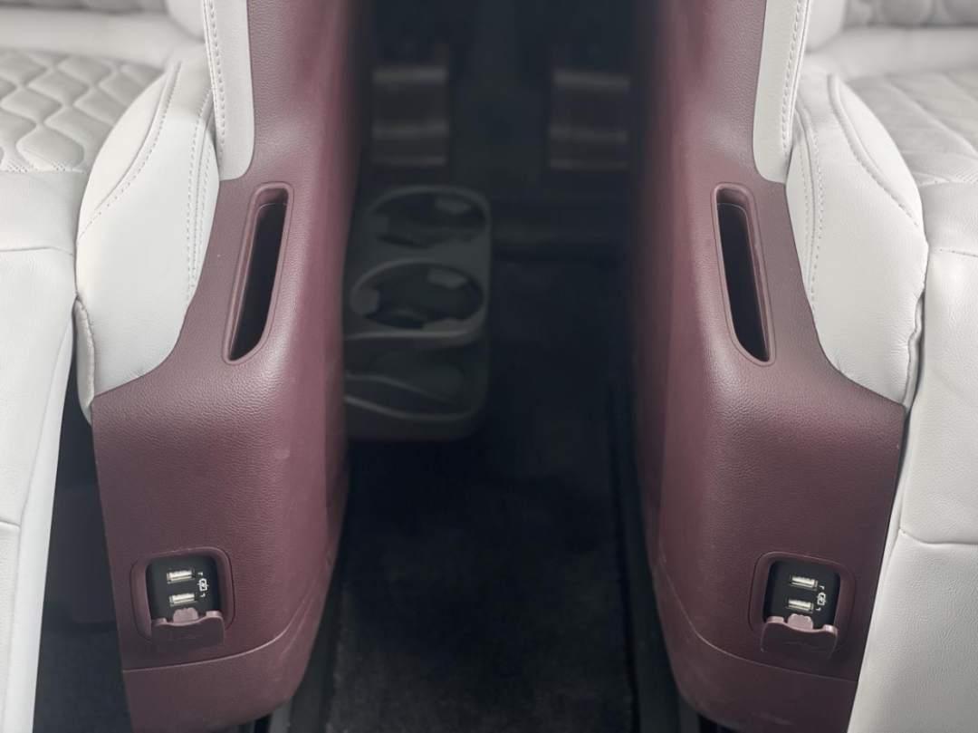 新款车型的很多提升其实都是在于细节方面,比较有意思的一点是,新款车型的第二排两个VIP座椅上的USB充电口加一起配备了4个,可谓ipad和手机电影都给你安排上了,而第二排脚下其实还有一个220V的五孔插座以及12伏电源接口,整个区域内电源接口算下来足足有7个,而全车三排座椅充电接口则足足有12个之多。