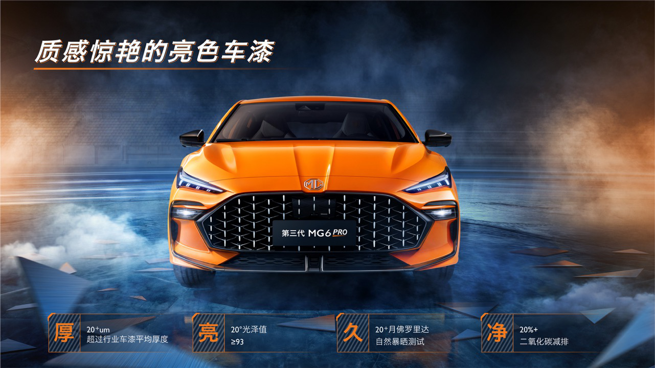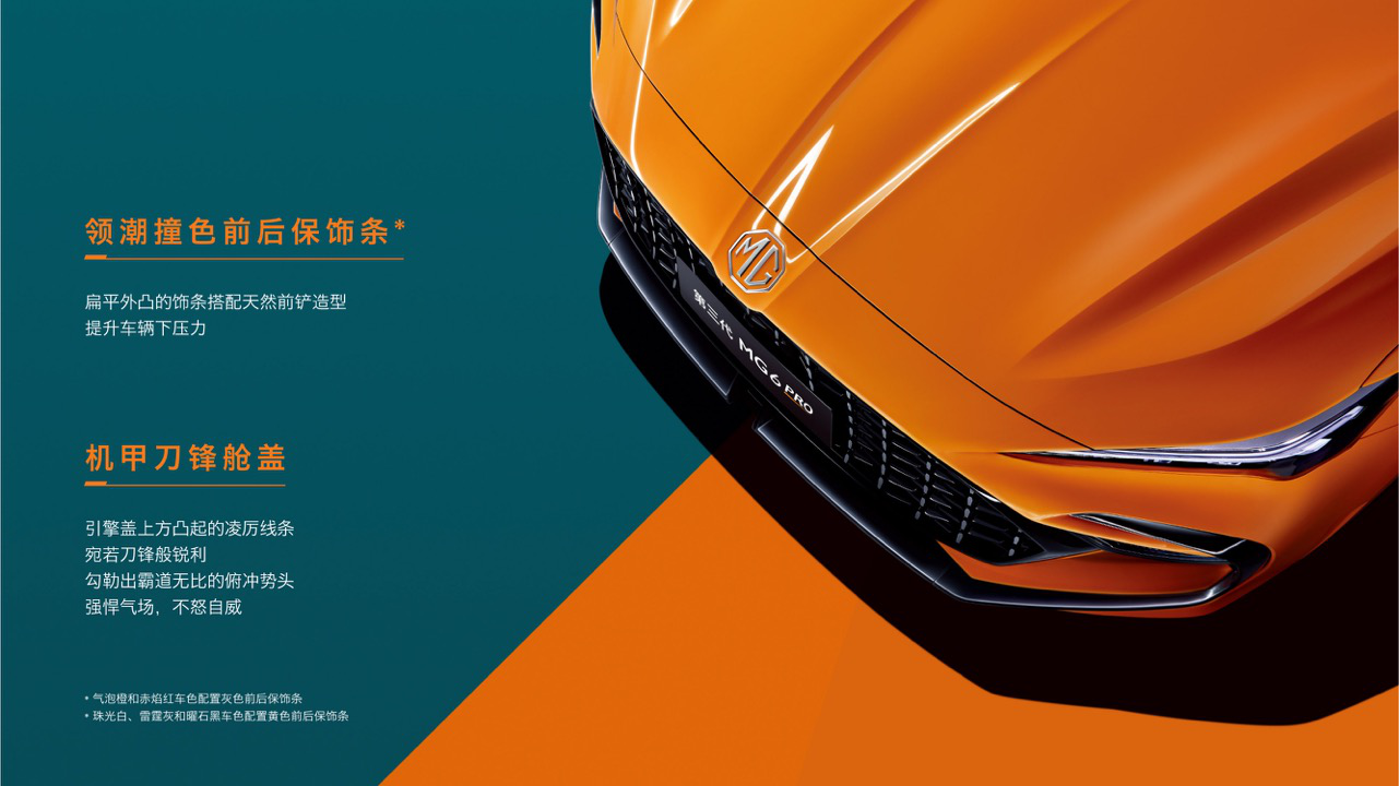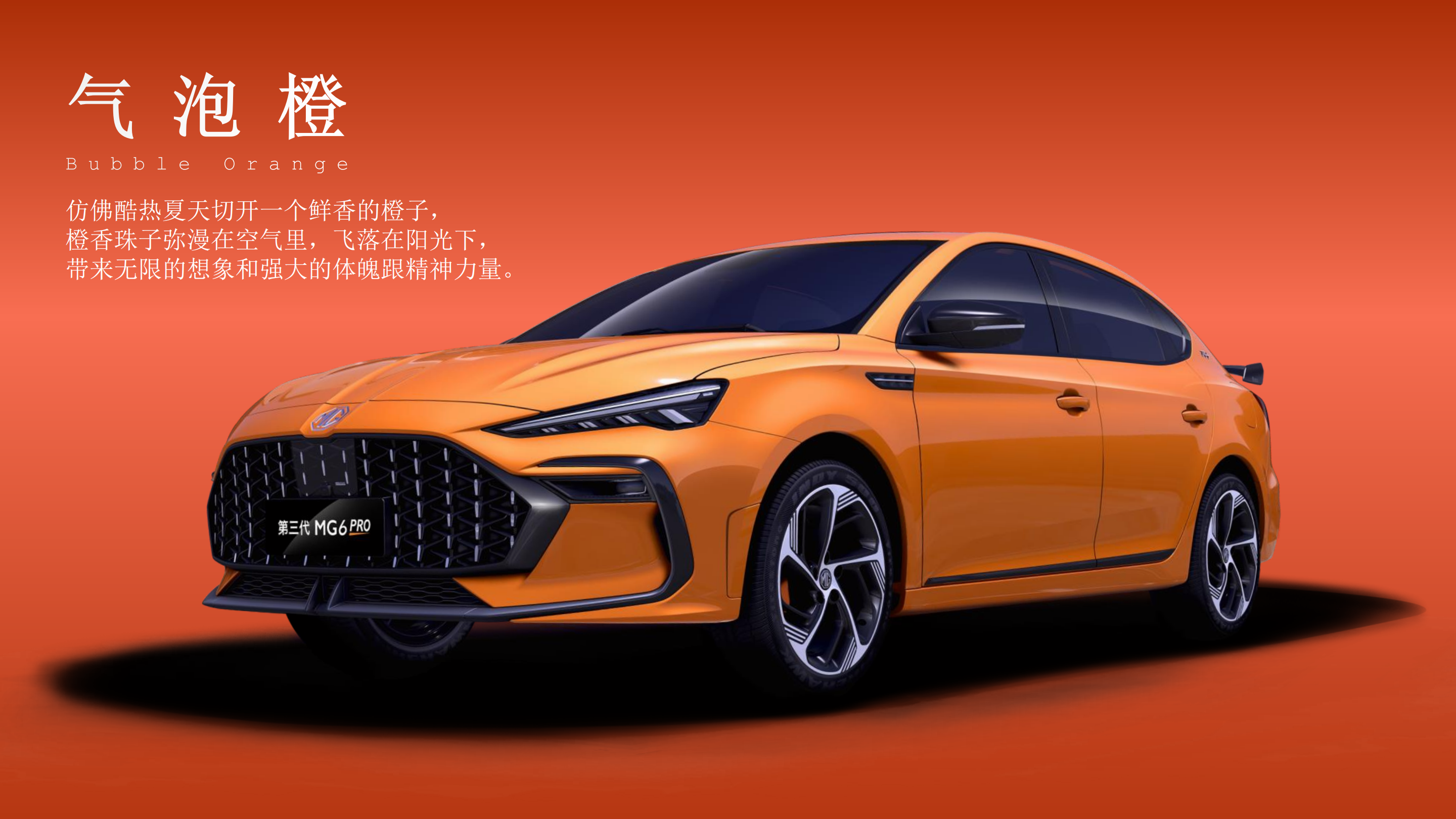 名爵6 Pro车漆色彩十分惊艳、气泡橙的靓丽武装下,MG6 PRO彷佛置身酷热的夏天,成为了一颗即将切开的浓郁鲜橙,在飞落在阳光下,折射出五彩的光芒。气泡橙的色彩尽显青春的荷尔蒙,这种激情、激进的涂装在同级别车型中也是相当少见的。同时该车型还提供气泡橙、赤焰红、耀石黑、珠光白和赛博灰等多种颜色选择,满足年轻消费者的喜好。