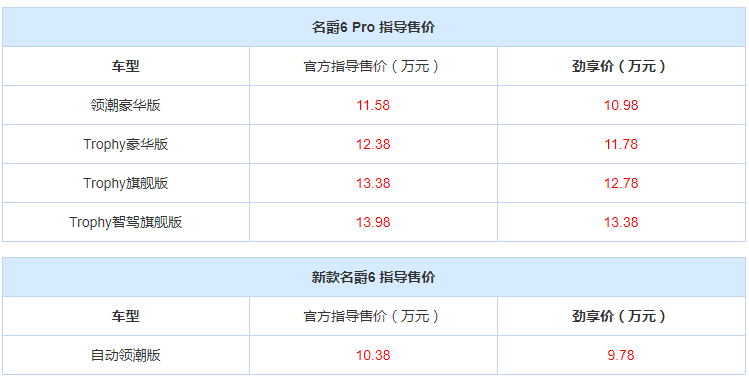 新款名爵6与名爵6 Pro一同上市,其中新款名爵6共推出1款配置车型,售价为10.38万元,劲享价9.78万元;名爵6 Pro共推出4款配置车型,售价区间为11.58-13.98万元,劲享价区间为10.98-13.38万元,其中劲享价是含官方推出的6000元现金红包、目前购车部分车型可现金优惠0.50-0.60万元。同时,官方还表示前1.6万名用户不仅可享终身质保,还能2年七折回购,更享0首付、0月供、0利率,终身VIP客户服务、终身免费基础流量等政策。