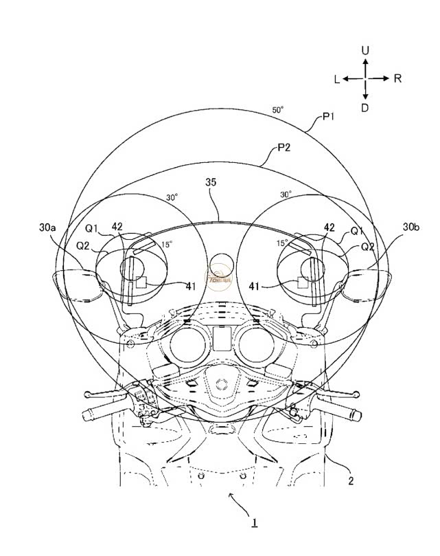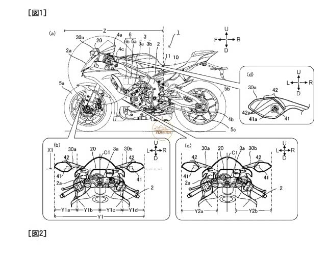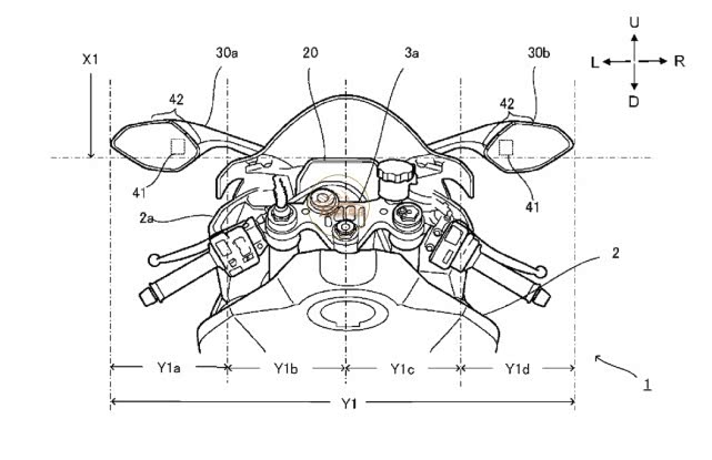 为了给出解决方案,雅马哈的专利使用了YZF-R1为基础,这款车根本没有空间容纳更大的仪表板,而且已经配备了TFT仪表,已经提供了相当大的信息量。雅马哈的想法不是让显示器变得更加复杂,而是在后视镜的反光玻璃后面安装额外的显示器,闪烁大的、可立即识别的图标,以提醒骑手注意危险。