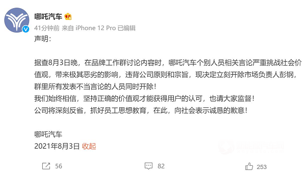 简单回顾一下,8月3日晚间网曝一张微信群聊天截图,哪吒品牌中心管理群的14人微信群内,一位昵称为“彭钢”的高管想借势已被刑拘吴某凡进行一波营销。对于品牌方来说蹭热点这事倒也无可厚非,但是由于吴某凡事件已经严重触及大家道德底线,哪吒汽车这位彭姓高管居然想要让失德艺人代言产品,为求流量毫无底线的行为让人愤慨。“出圈”这个词的意思指的是从圈内到进入大众视野的过程,哪吒汽车品牌负责人为了“出圈”不择手段的做法被曝出后立马登上热搜,鉴于形成了极坏的社会影响,随后哪吒汽车火速开除相关人员证明自己清白。但是由于反应过于快速,处理手段过于铁腕反倒让人感觉有着浓重的公关痕迹,所以急着证明清白的哪吒汽车反而变得不清不白。