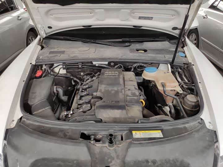 来到发动机舱,老款A6L的机舱比较简陋,没有现款那样丰满有包裹性,卖家也没有对机舱进行整备清洗,表面灰尘还是挺多的。2.0T的二代EA888匹配CVT变速箱,性能跟现在的新款肯定没法比,而且漏油和烧机油是大概率事件,等会儿要留意检查。