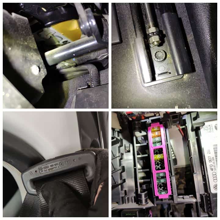 座椅螺丝无拆卸拧动,底部线束插头无水渍泥沙痕迹;安全带制造日期匹配得上;底板死角比较脏,但没有沙粒泥块,基本排除了内饰泡水的可能性。