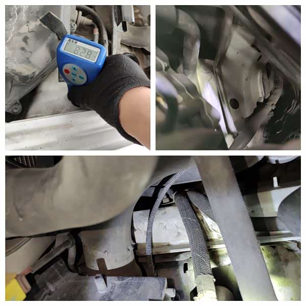 一圈漆面检测下来,让天宝没想到的是,车顶竟然是全车唯二的原车漆,剩下80%的漆面都存在二次喷漆的情况,前机盖、左前翼子板、行李箱盖以及整个右侧车身都做过钣金腻子修复,最严重的是右C柱内侧钣金,根据国标文件可以判定为事故车了。