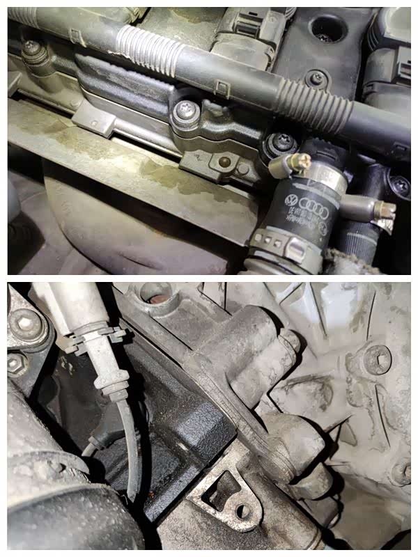 来看发动机本体,发动机工况一般,气门室盖垫螺丝拆卸,还有渗油的现象;零部件拆卸痕迹比较明显,进气歧管拆卸,排气歧管拆卸,分解维修的可能性比较大。这个年限的EA888,拆卸维修再正常不过,至于有没有彻底分解维修,还得上架进一步从底盘确认。