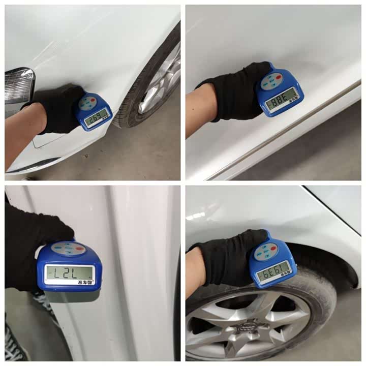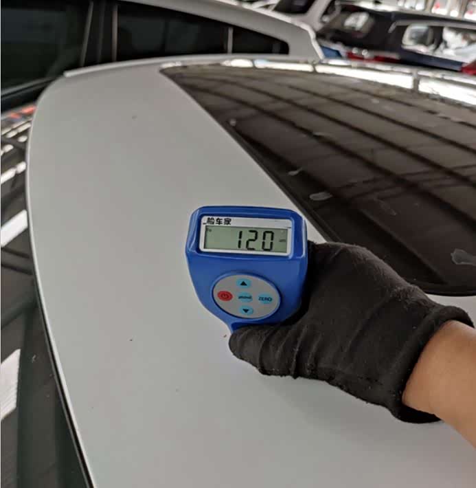 车顶表面摸起来自然顺滑,没有色差、脏点、橘皮颗粒等后喷漆特征,目测还是原车漆。漆膜仪打一遍,漆面数据均在120μm上下,分布均匀,那么这个数据就是原车漆的厚度,可以作为衡量标准来检测其它部位的漆面。