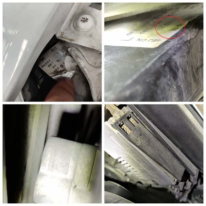 前大灯的制造日期是2011年7月,水箱框架是2011年9月,最前端的冷凝器、散热器风扇也是差不多的时间,均在原车总装出厂周期范围内,都是原厂件,由此可以排除前方重大事故的嫌疑,毕竟前部的塑料易损件比较脆弱,一旦有碰撞,非死即伤。
