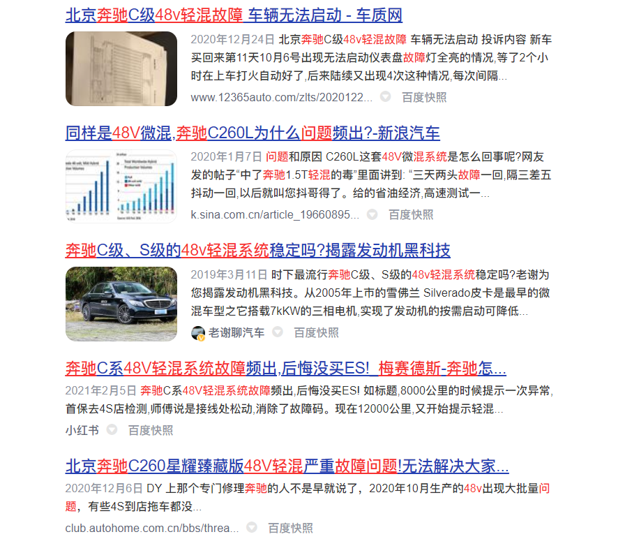 实际上,关于奔驰48V电力系统故障的问题,此前已经报道了不少。对于奔驰C级“48V电机故障”的问题,在网络上搜索就能够看到很多类似的事件。