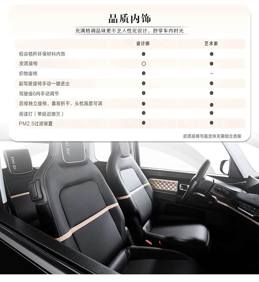 车内提供有浅、深两种配色方案。浅色内饰采用深冷灰撞色搭配;深色内饰采用经典碳黑与玫瑰金搭配。同时,KiWi EV的内饰材质还使用了环保材料内饰,标配副驾驶座椅手动一键进出、驾驶座6向手动调节、后排独立座椅、PM2.5过滤装置等。
