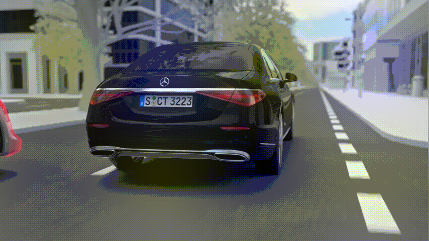 此外,全新S级轿车还具备“防剐蹭功能”——在行驶过程中一旦系统检测到和旁边车辆过于靠近,有剐蹭碰撞的风险,其主动式盲点辅助系统系统就会对另一侧轮胎进行刹车,从而控制车辆主动向另一侧移动,规避风险。