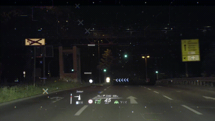 除了能屏蔽对向来车和前方车辆所在的远光灯照射区域之外,这套大灯还拥有强大的信息传达功能。对于路边阴暗处的行人,这套大灯将会在车头和行人之间的路面上投射一串圆形光斑,向驾车者明确显示行人所在的方位。