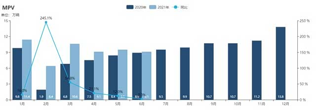 根据乘联会数据显示,6月份MPV销量为9.1万辆,从上半年数据来看,其2021年1-6月累计销量为56.3万辆,同比增长30%,略高于乘用车市场29.8%的平均增幅。