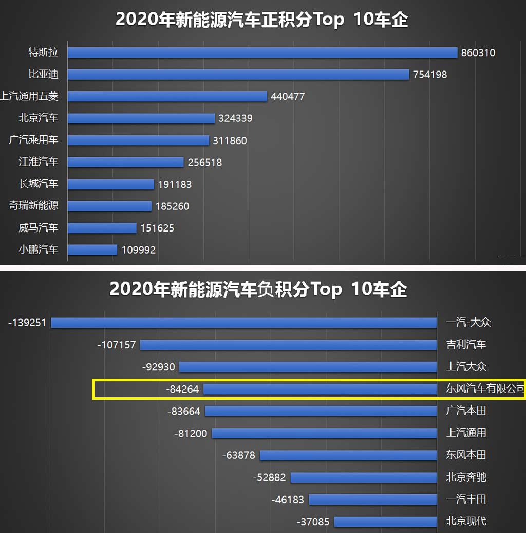 2020年,东风汽车有限公司(包括东风日产)的平均燃油消耗量积分为-395950分,排名倒数第十;新能源积分为-84264分,排名倒数第四,这意味着东风日产同样有很大的双积分压力。解决这个问题有两条路,一、燃油车排放合标,新能源车形成战斗力,实现正积分;二、通过购买其它企业的正积分来填补自己的负积分。