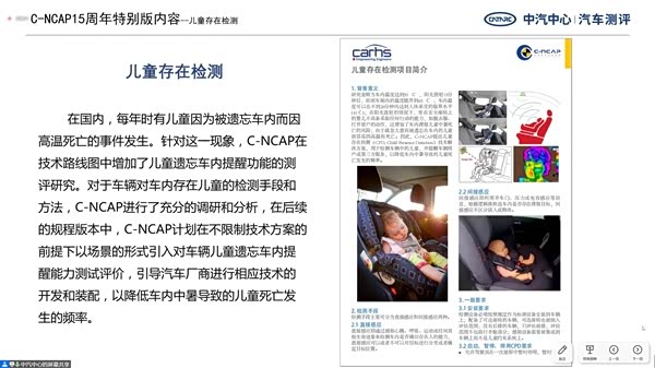 对于车辆对车内存在儿童的检测手段和方法,C-NCAP进行了充分的调研和分析,在后续的规程版本中,C-NCAP计划在不限制技术方案的前提下以场景的形式引入对车辆儿童遗忘车内提醒能力测试评价,引导汽车厂商进行相应技术的开发和装配,以降低车内中暑导致的儿童死亡发生的频率。