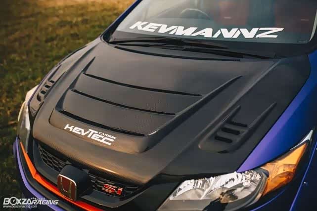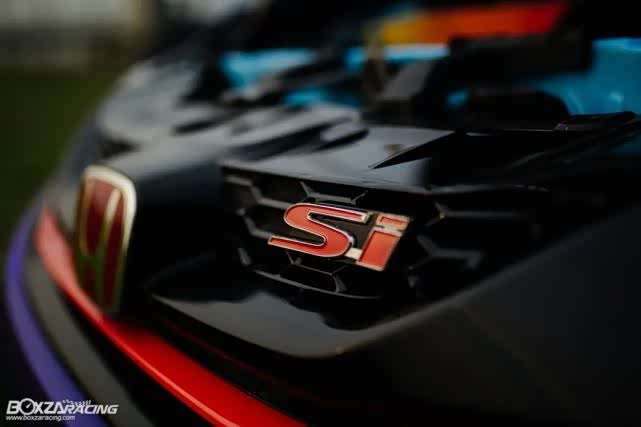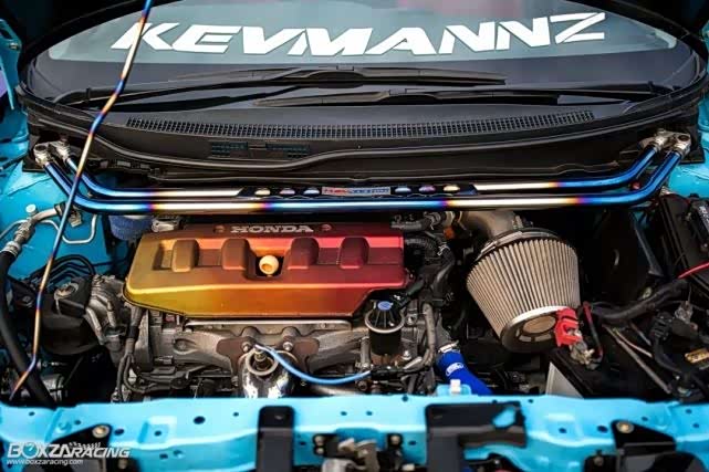 图:这台车上上下下都显示出了思域Si的元素,不过引擎方面要让大家失望了,这一副只是单凸轮轴SOHC的2.0公升引擎,并改装了来自Blitz的“冬菇头”。前顶巴是304不锈钢材质打造的,不过通过镀蓝的处理显得很“性能”。