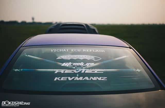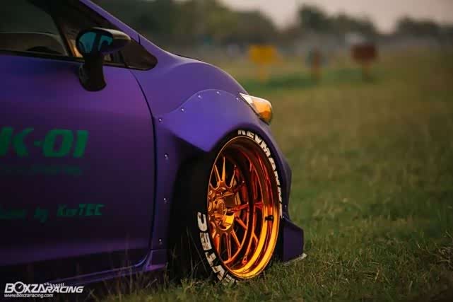 图:站在姿态改装爱好者的角度里,宽体套件的最主要作用是增添了整车的肌肉感,使得视觉冲击更加强烈,不过对操控的影响却是十分大,至少方向盘必然比原厂状态重了许多。另外,此宽体套件是由泰国人自主设计打造的,吻合度还算不错。