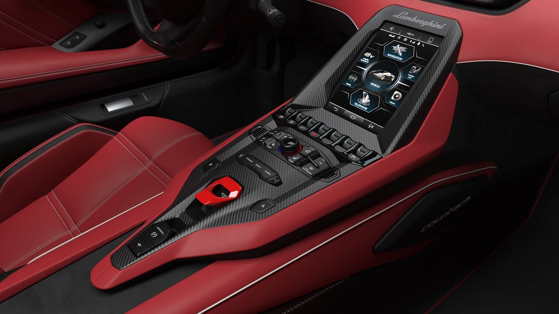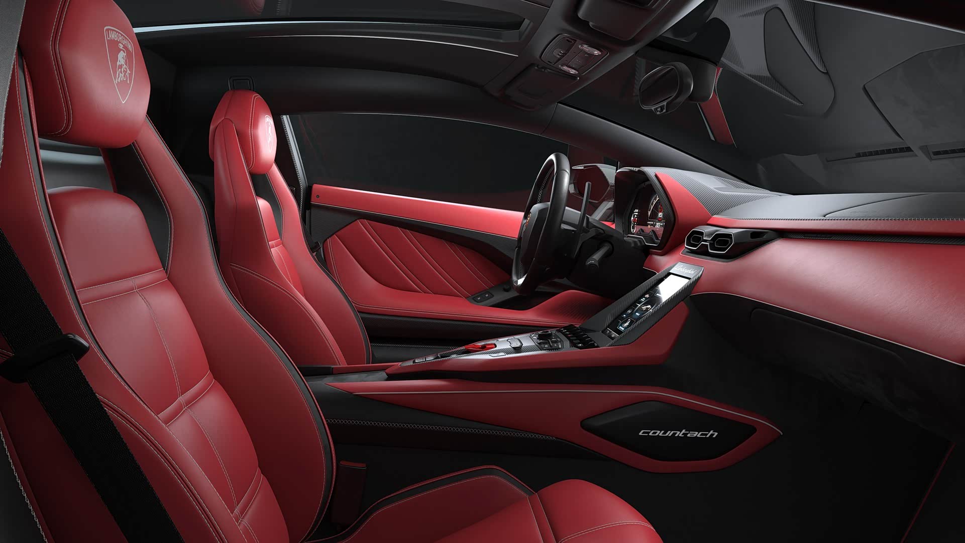 在内饰部分,新车当然不会照搬几十年前的产品,而是采用了兰博基尼最新的家族风格,仪表盘采用了三块液晶屏幕分别显示不同的信息内容,做到了一目了然,同时与中控台面斜向镶嵌于出风口下方的液晶屏幕形成了多屏系统,有着不错的科技感。当然对于一款超跑车型,拥有尺寸超大换档拨片的碳纤维方向盘和大面积醒目的红黑皮革覆盖,随处可见的碳纤维纹理,以及战斗感十足的一体式座椅等细节都不会缺席,显示出与外观相称的运动激情。