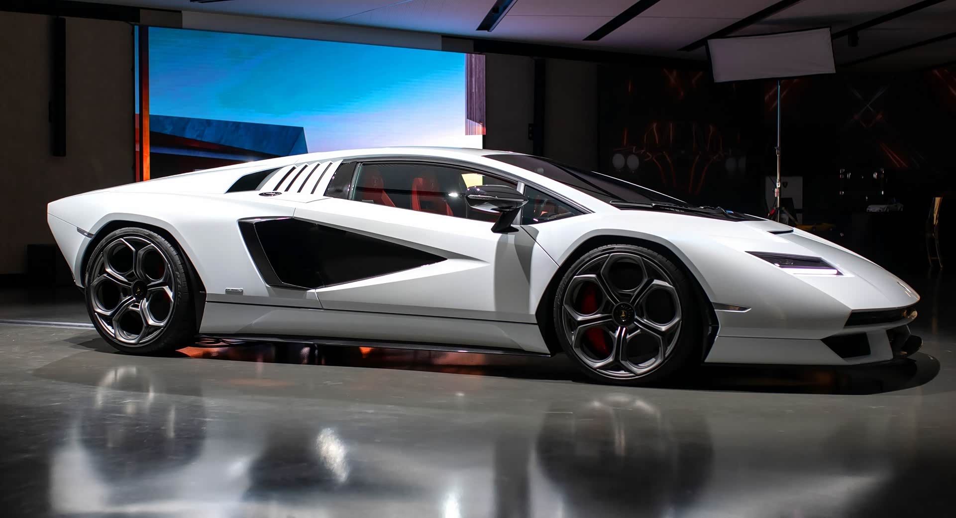 在车身侧面,Countach标志性的楔形造型与2021年汽车设计的时尚线条相结合,同时兼备了复古风格和未来感,令人印象深刻,而招牌的发动机两侧隆起线条也如出一辙,当然如今的新车,在成体尺寸上比当年的大了不少。车窗后方和车门后方同时存在的夸张的进气道,则显示的强劲的性能。当然,作为一款兰博基尼限量车型,招牌的剪刀门也不会缺席。