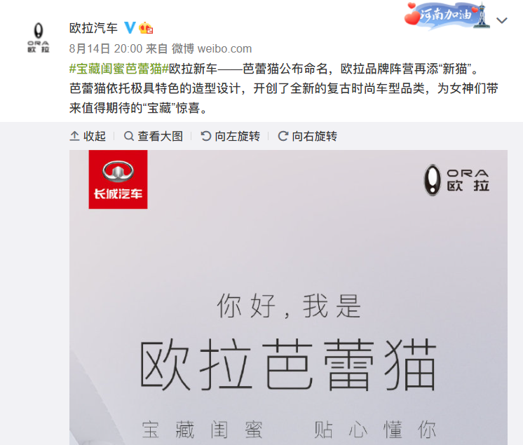 8月14日,欧拉汽车正式宣布新车命名为“欧拉 芭蕾猫”,在七夕这一天主打可爱呆萌的欧拉品牌动作可真不少,除了推出新款 欧拉黑猫、白猫小野猫版外,芭蕾猫也正式入园了,在欧拉看来,猫的品种五花八门,不同品种的猫,有不同的性格,适合不同的人。据悉,新车将于本月底在即将开幕的成都车上正式亮相。