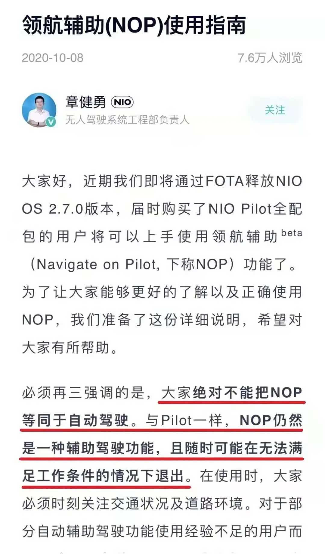 既然不能实现真正的无人驾驶,其实现在看来就是个“鸡肋”的配置,蔚来汽车也把NOP作为选装配置,也是对这个配置功能信心不太大的体现,加上推送NOP时也有详细说明存在的弊端,NOP就是一个过渡产品。但是,蔚来汽车尝鲜的用户对此功能都很上心,包括蔚来汽车的高层,某蔚来认证副总裁博主曾发言,在自动辅助驾驶帮助下,放心地边吃东西边开车。
