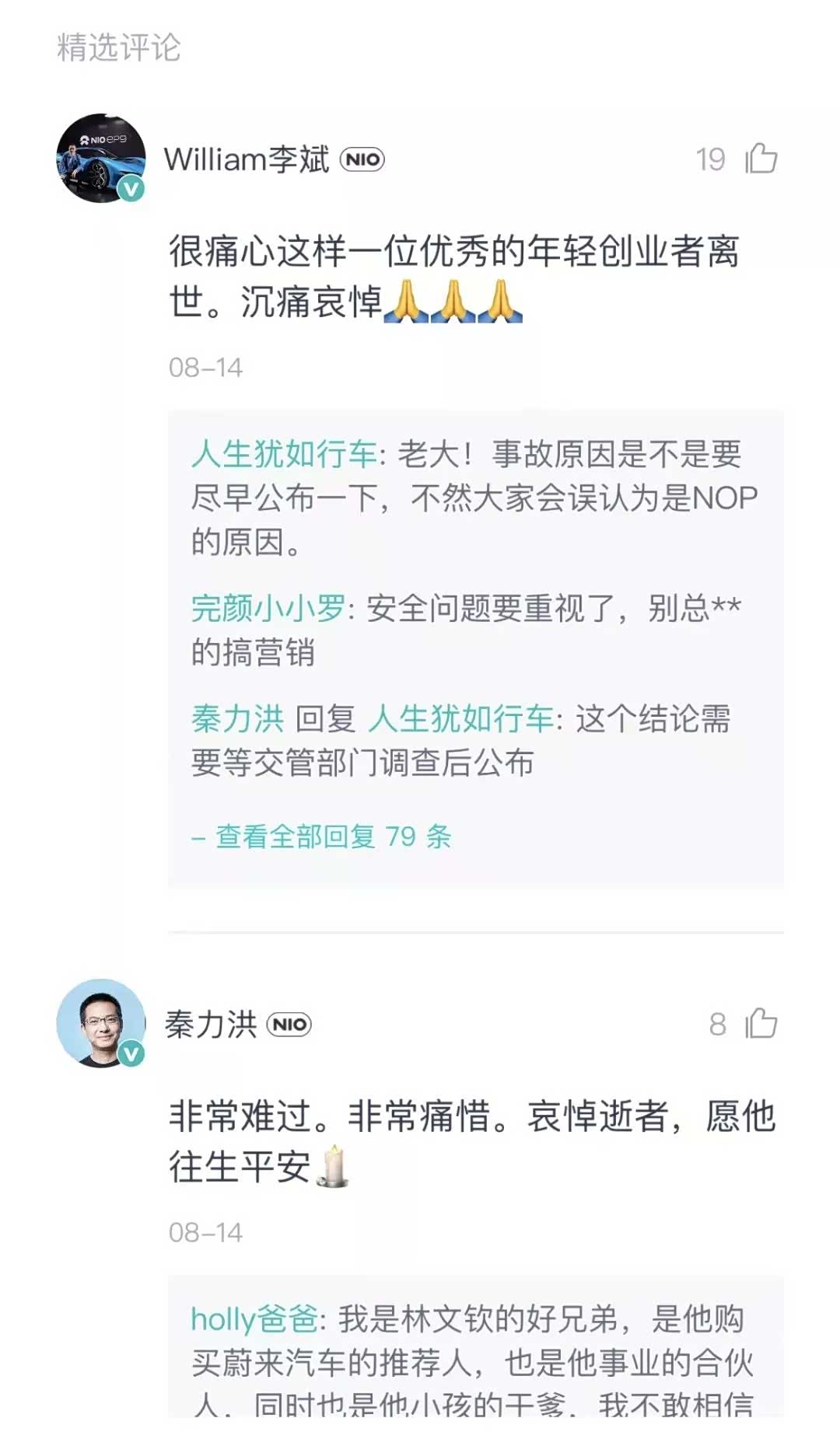 蔚来汽车创始人李斌在蔚来APP发言称:很痛心这样一位优秀的年轻创业者离世,沉痛哀悼。蔚来汽车联合创始人秦力洪也表示:非常难过,非常痛惜,哀悼逝者,愿他往生平安。
