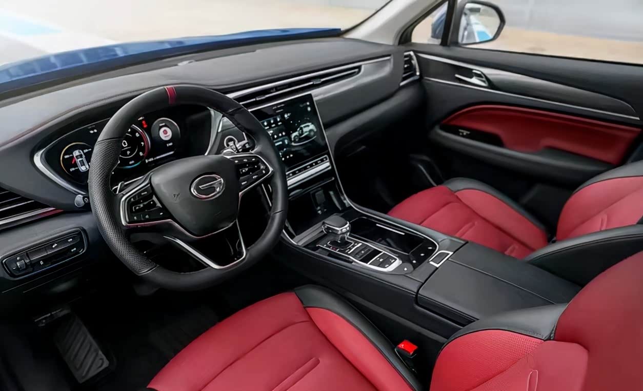 内饰方面,传祺GS4 PLUS采用了“曜石黑”和“丝绒红”的色彩组合,同为双色的三幅平底方向盘,握感得体、舒适,红色的回正标识也适时激发着驾驶者的运动激情。