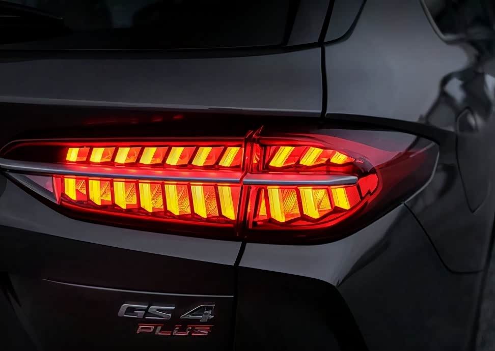 传祺GS4 PLUS尾灯单体造型较长,灯体被哑光金属材质饰条贯穿,使得尾灯整体有了更强的立体感,灯源点亮后构成燃烧的羽毛造型,辨识度还是很高的。