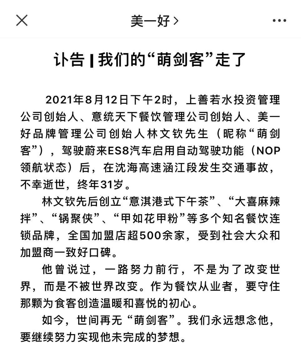 相关的事件回顾,8月12日美一好”公众号发布讣告称,美一好品牌管理公司创始人林文钦,在驾驶蔚来ES8汽车启用自动驾驶功能(NOP领航状态)后,在沈海高速涵江段发生交通事故,不幸去世,终年31岁。