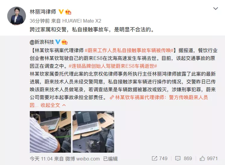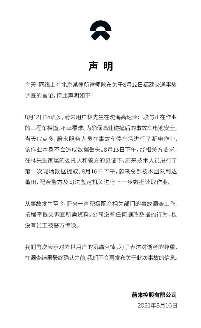 昨日,林某钦家属委托代理林丽鸿律师发文表示:蔚来公司的技术人员没有经过交警同意,私自接触涉案车辆,这是违规的!对此,蔚来汽车随后也发表声明表示,公司没有任何删改数据的行为,也没有员工被警方传唤。蔚来汽车表示,8月12日14点多蔚来用户林先生在沈海高速涵江段与正在作业的工程车相撞不幸罹难。为确保高速碰撞后的事故车电池安全,当天17点多,蔚来服务人员在事故车停车场进行了断电作业,该作业本身不会造成数据丢失。蔚来汽车还称,从事故发生至今蔚来一直积极配合相关部门的事故调查工作按程序提交调查所需资料。公司没有任何删改数据的行为,也没有员工被警方传唤。