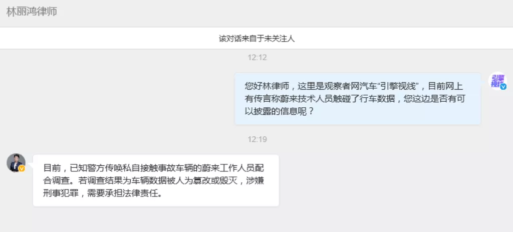 林先生表示,这是蔚来在警方、林家家属均不知情的情况下对车辆进行操作。林文钦事件的律师已经正式对林文钦案件的经办民警提出要求,对私自接触故障车辆人员进行相关处理。