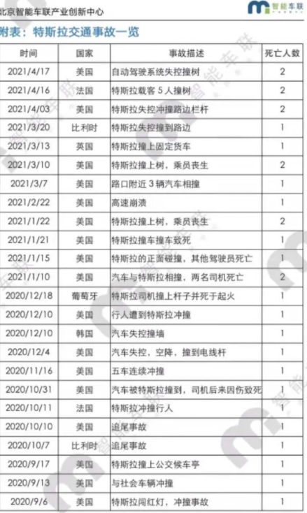 据北京智能车联产业创新中心不完全统计,自2013年4月2日至2021年4月17日,特斯拉在全球范围内已发生数百起交通事故,累计造成175人死亡,其中事故原因有突然加速/减速、刹车失灵、自动驾驶系统等。而在企业宣传方面,特斯拉以“FSD 完全自动驾驶”自称,这给了不少用户留下了“自动驾驶”的错觉,当用户过于信任自动辅助驾驶系统,就放弃对汽车的主控权时,一旦发生危险,也没有办法挽回。在今年 3 月,特斯拉也明确表明了FSD“不属于自动驾驶系统”,而只是“智能辅助驾驶系统”。