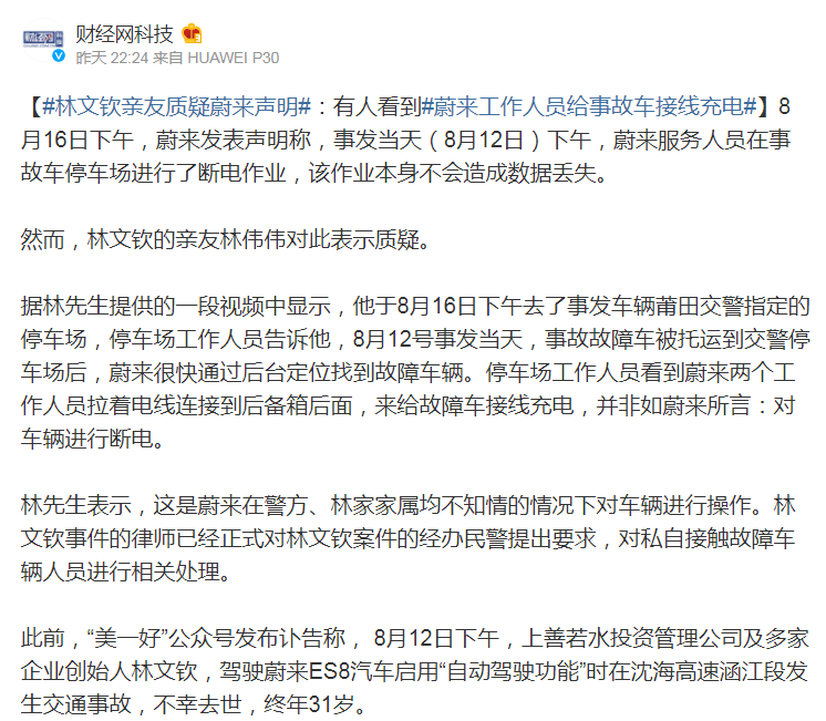 值得注意的是,在8月16日晚,据@财经网科技报道,林文钦的亲友林伟伟对此表示质疑。据林先生提供的资料显示,其在8月16日下午去了事发车辆莆田交警指定的停车场,停车场工作人员告诉他,8月12号事发当天,事故故障车被托运到交警停车场后,蔚来很快通过后台定位找到故障车辆。停车场工作人员看到蔚来两个工作人员拉着电线连接到后备箱后面,来给故障车接线充电,并非是蔚来所说的:对车辆进行断电。