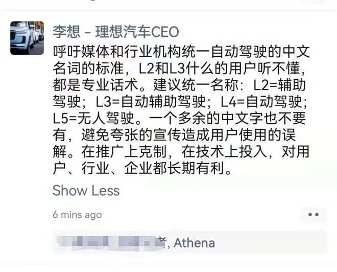 昨日,理想汽车 CEO 李想也在朋友圈发文称,建议对自动驾驶统一名称,如 L2 = 辅助驾驶、L3 = 自动辅助驾驶、L4 = 自动驾驶、L5 = 无人驾驶。企业最好一个多余的字都不要有,避免夸张的宣传造成用户使用误解。随后,360周鸿祎表示赞同李想“自动驾驶”观点!哪吒汽车也发布了相关的微博表示:不能因为营销误导用户。