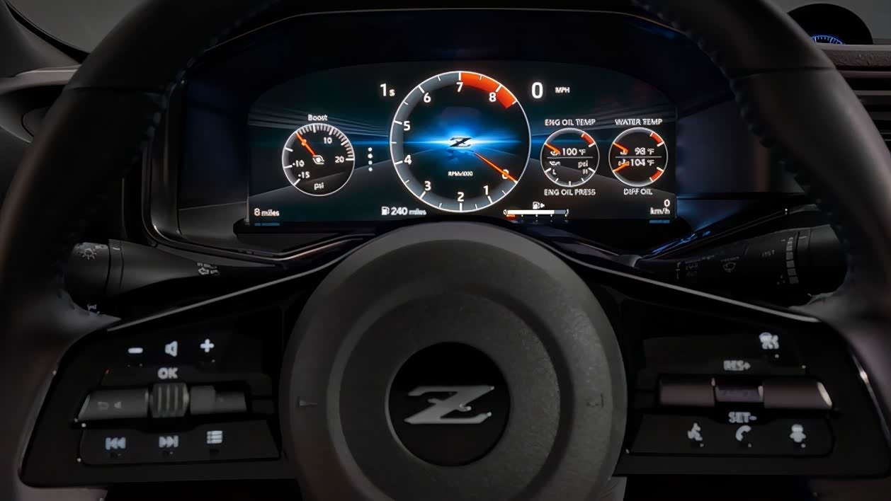 内饰上,座舱的整体布局跟上一代370Z还是有很多相似之处,只是一切都变得更加现代化了。三幅式方向盘设计得很垂直,符合跑车的风格。新车配备了全液晶仪表和内嵌式触控大屏,而且中控台的上方还有经典的三联表设计,可随时查看涡轮的工作状态。