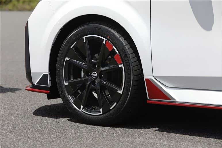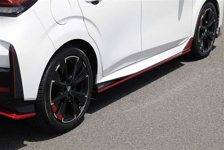 黑色的轮毂很好的营造出了运动氛围,轮毂内侧还有两块条幅之间的红色装饰,另外车身侧面下方也有红、黑色的NISMO包围,跟车身前后的包围风格一致。