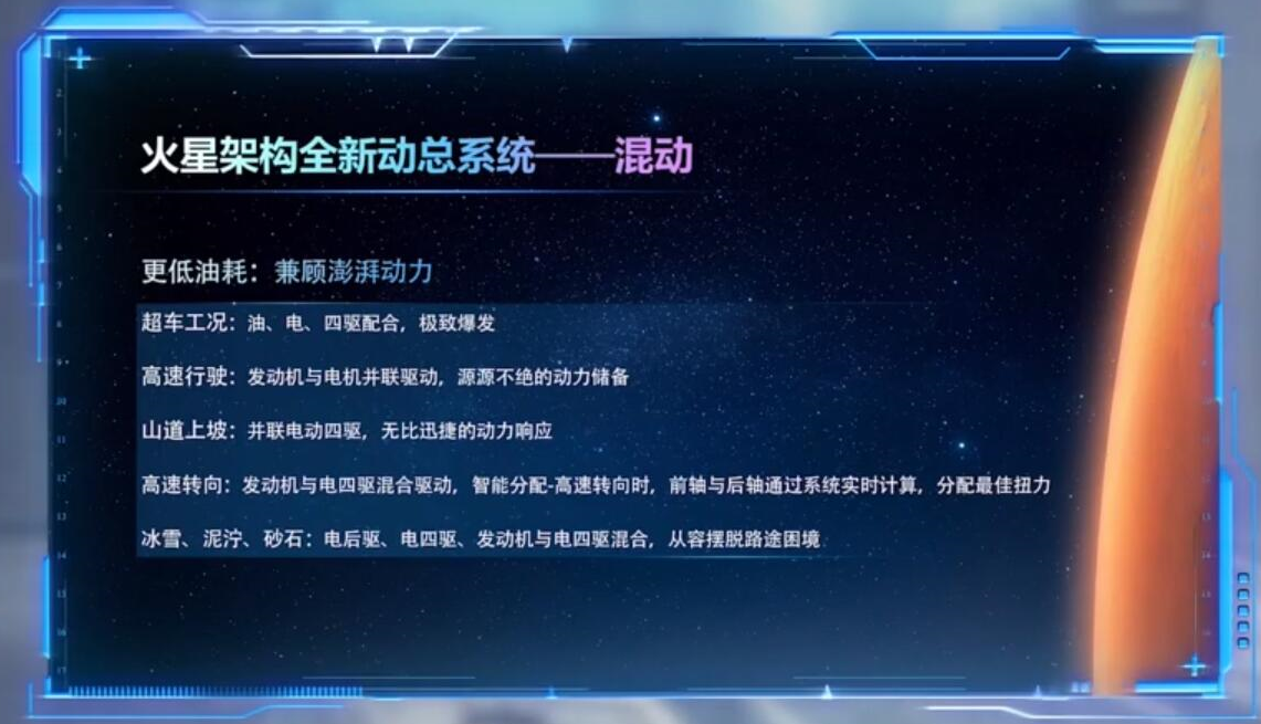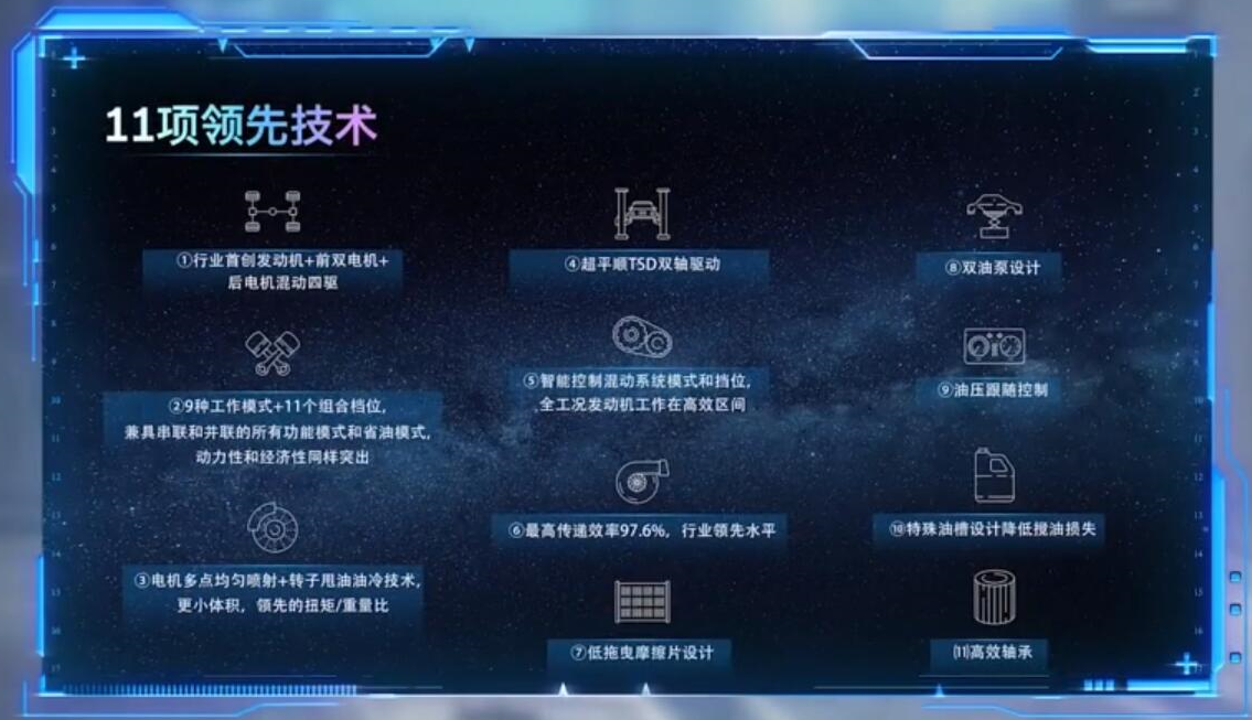 但是看到接下来出现的11项领先技术第一个,行业首创前双电+后电机混动四驱就明白了,这不就是上海车展上的DHT鲲鹏混动的相关介绍吗?下面的9种工作模式(单/双电机驱动、增程、并联、发动机直驱、单/双电机制动能量回收、行车/驻车充电等9种高效能工作模式)+11个组合挡位也是一模一样,之后后面的介绍此前都有过详细的介绍,这里就不再赘述了。