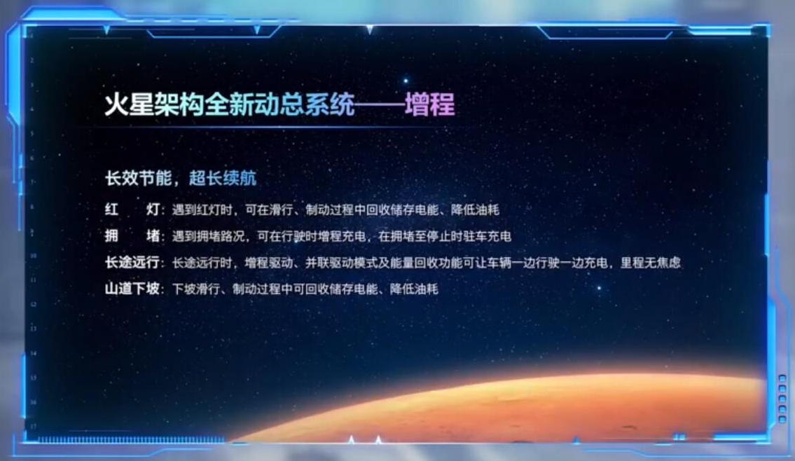 增程模式也丝毫不意外,同样在9种工作模式中就已出现“增程”、“单/双电机制动能量回收”与“行车/驻车充电”三种模式信息,与火星架构增程信息里提及的完全一致,当然这张图里也不是说完全没有其它信息出现,起码下坡滑行回收电能的字眼是首次出现。