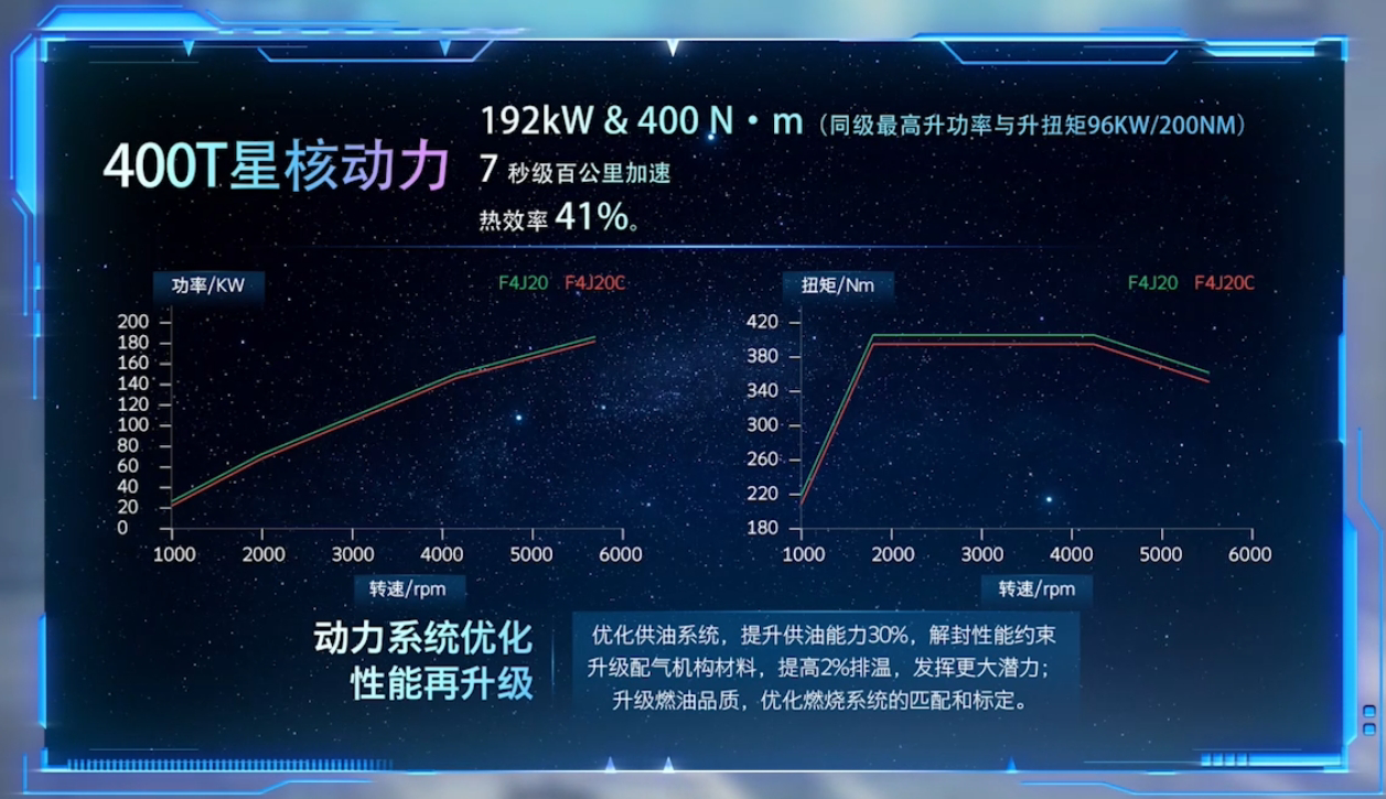 400T的介绍与此前披露的信息基本吻合,但是这曲线图出现了问题,绿色的F4J20发动机(代表390T型),红色代表F4J20C(代表400T型),问题就出现在这里了,曲线图怎么看都是绿色高于红色,也就是说,这发动机曲线图色调标注出了问题,同时官方前期披露的F4J20C的192Kw是在5000rpm(转)达到,根据这功率曲线图,也不对路,这曲线完全一致的情况下,只能是5500rpm,这PPT图不仅仅是色调标注出现了问题这么简单。
