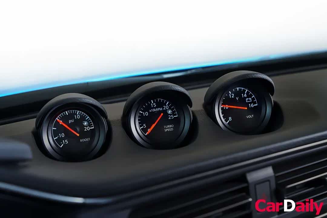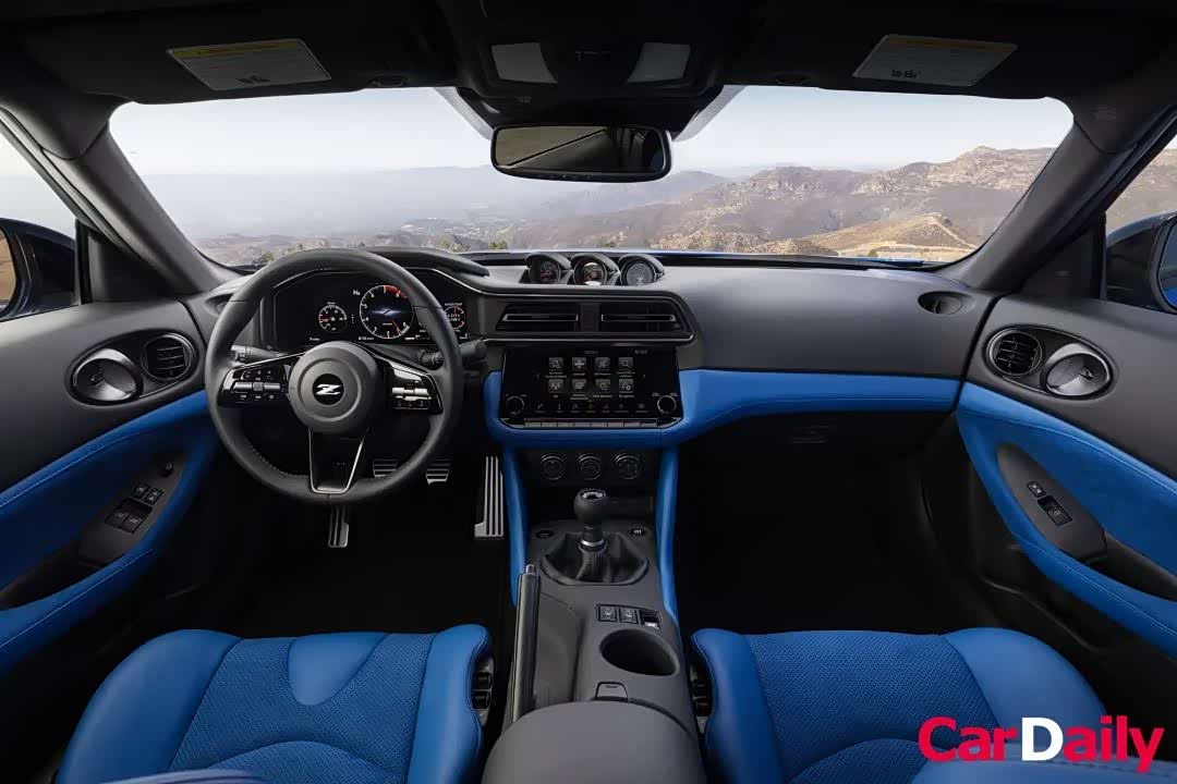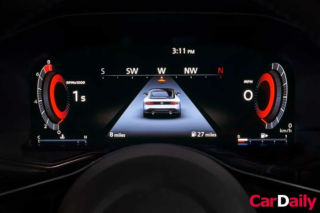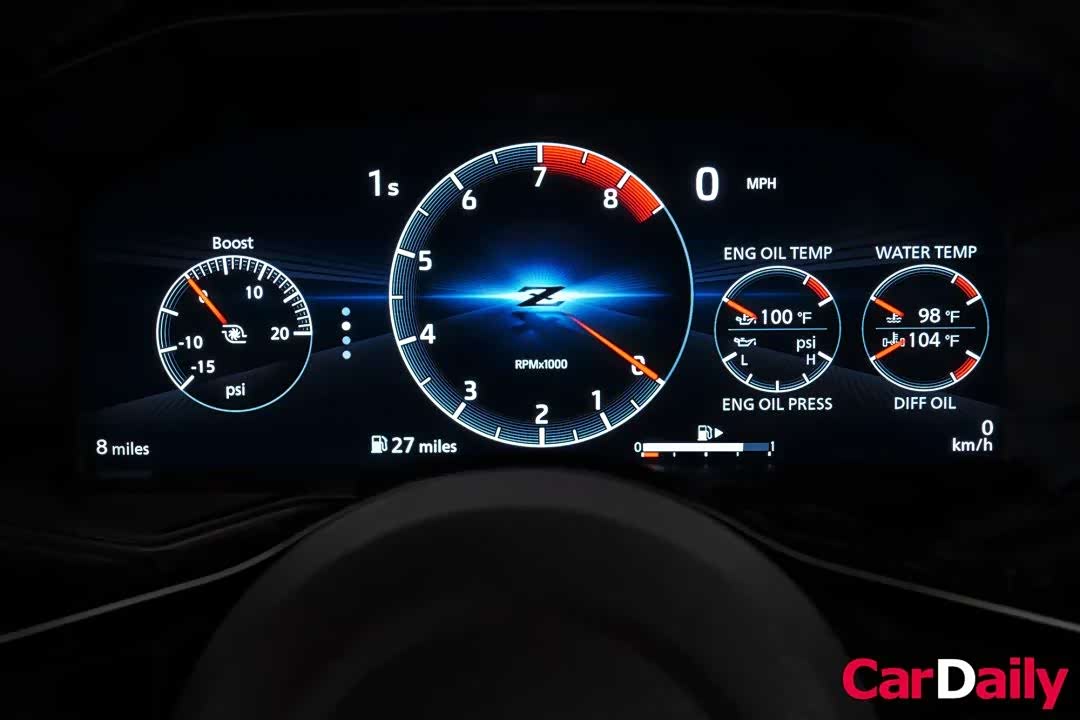 仪表盘为12.3英寸液晶屏,这是新Z的新装备,有标准、增强和运动三种显示模式,后者突出显示转速表和换挡提示灯,旁边的小仪表可以显示增压压力或g值。