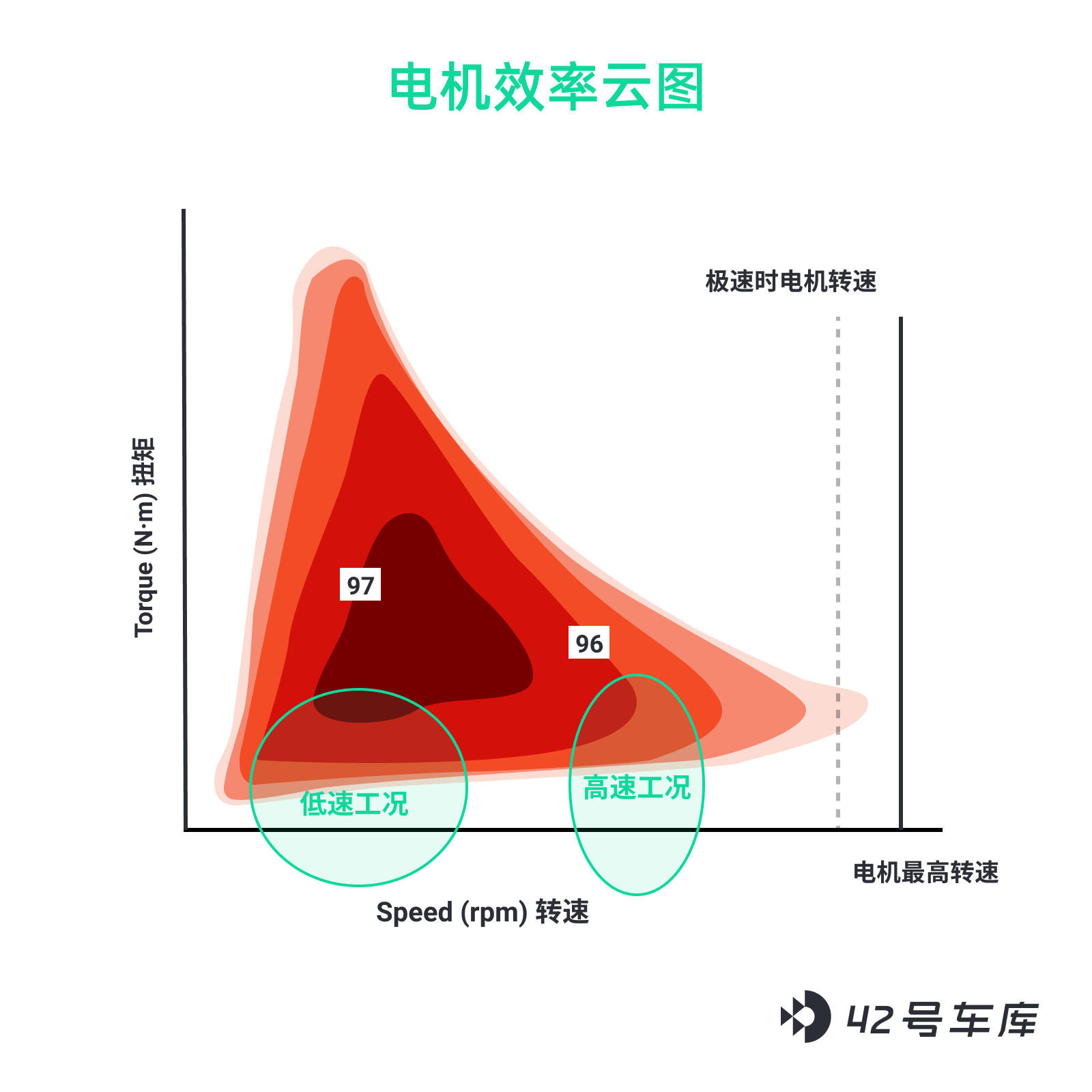 但这些环节大家的损失比较类似,这个差异其实已经跟电驱一个是 97.86% 另一个可能是 97.53% 的差异类似,这种小数点后面两三位没有影响。我反倒更关注的点,是想知道用户怎么开车,用户开车可能是这样,低扭矩区开到一定的速度,然后能量回收在这里,这个我们叫云图,我最后关注的那些点是我能不能把电机这个图往下。
